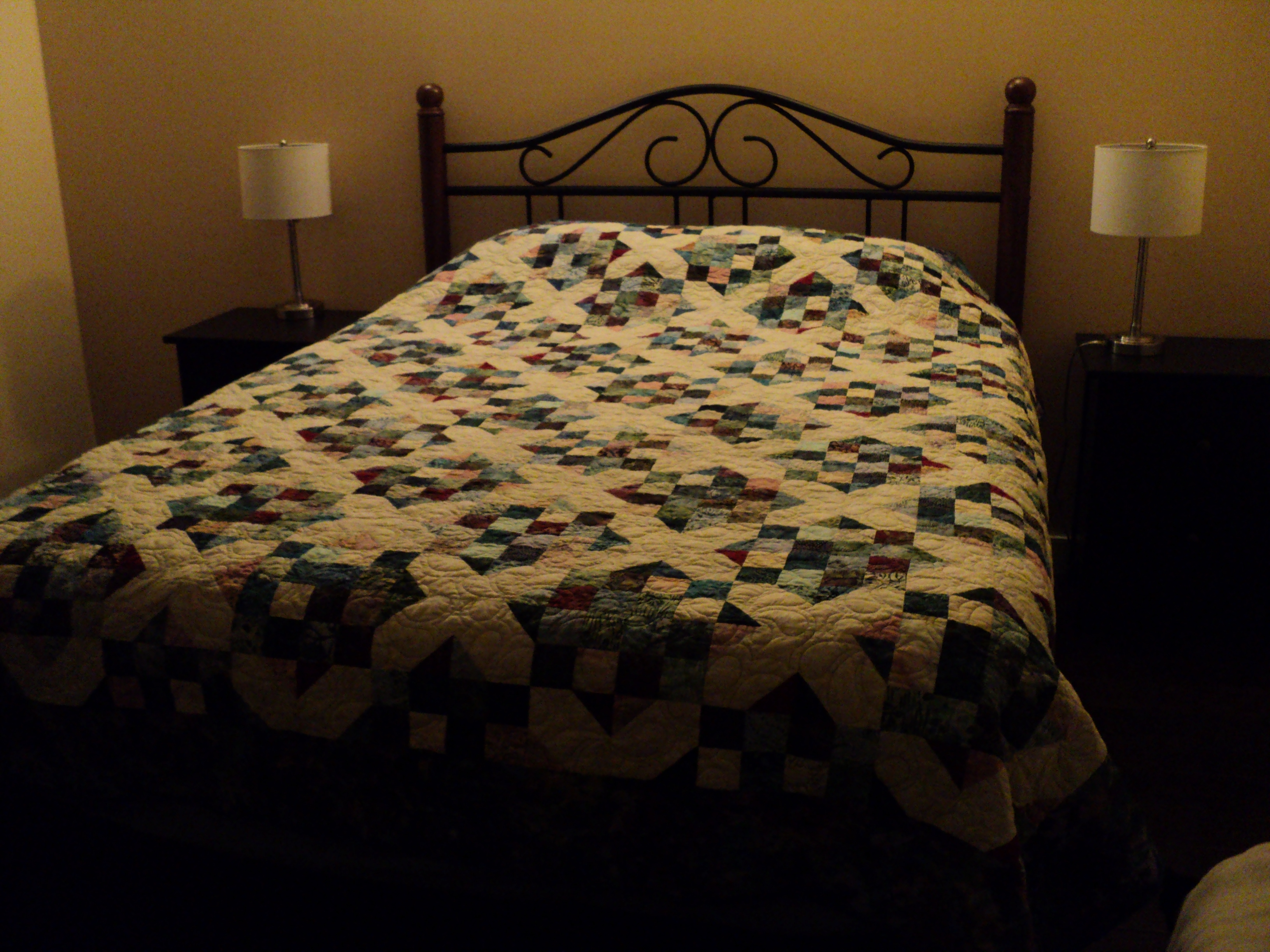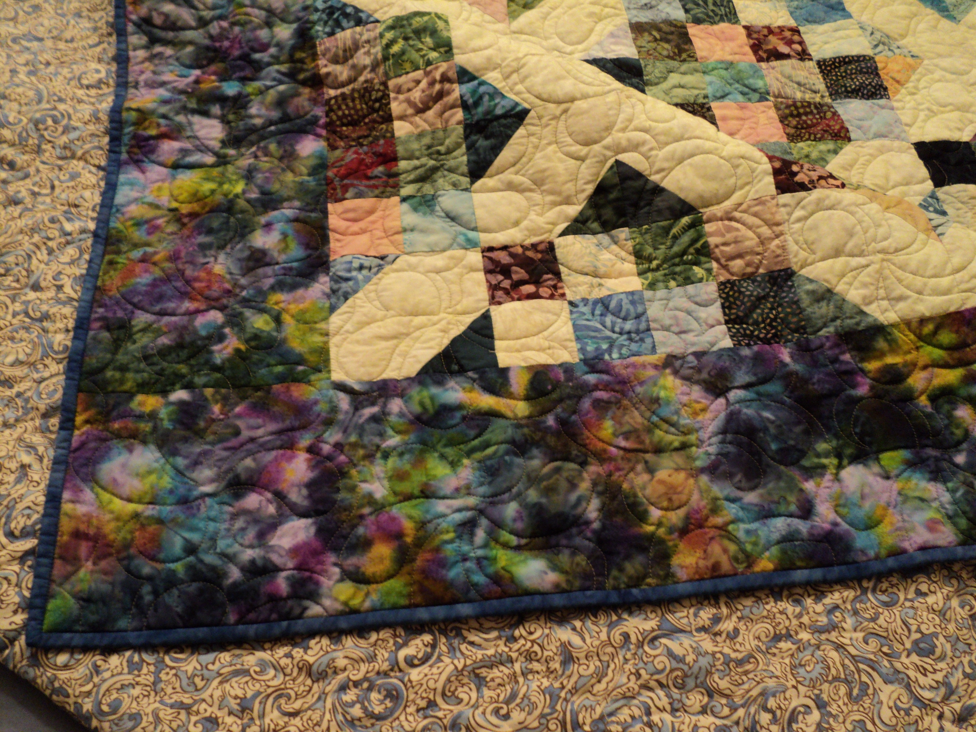 i had this Arkansas Crossroads quilt top completed some time ago, and when i showed it to Cathy, she said it was perfect. i added some borders and quilted it up for her. I made the top using batik scraps and a consistent background fabric to tie it together. I had a hard time trying to find a border fabric that pulled all of the colours i used, but i found one that i liked well enough.